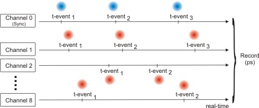 В режиме T2 все сигнальные входы HydraHarp 400 функционально идентичны. Нет выделения одного канала для синхросигнала. Все входы могут использоваться для подключения фотонных детекторов. События со всех каналов записываются независимо и обрабатываются одинаково. В каждом случае генерируется запись события, содержащая информацию о канале, с которого оно поступило, и времени прибытия события относительно общего начала измерения. Если временная метка переполняется, в поток данных вставляется специальная запись маркера переполнения, так что при обработке потока данных теоретически бесконечный промежуток времени может быть восстановлен с полным разрешением. Время простоя существует только внутри каждого канала (тип 80 нс), но не по всем каналам. Следовательно, взаимные корреляции могут быть рассчитаны с точностью до нулевого времени задержки. Это позволяет реализовать новые мощные приложения, такие как FCS, со временем задержки от пикосекунд до часов с помощью одного прибора. Автокорреляции также могут быть рассчитаны с полным разрешением, но, конечно, только начиная с времени задержки, превышающего время ожидания.