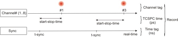 Режим с временной меткой для записи отдельных фотонных событий с указанием времени их прибытия по всем каналам позволяет проводить наиболее сложный автономный анализ динамики фотонов. Данные с временной меткой и разрешением по времени (TTTR) также могут быть сопоставлены в режиме реального времени для мониторинга экспериментов FCS со скоростью счета до 1 000 000 отсчетов в секунду. В режиме TTTR устройство может быть синхронизировано с другим оборудованием, таким как сканеры.