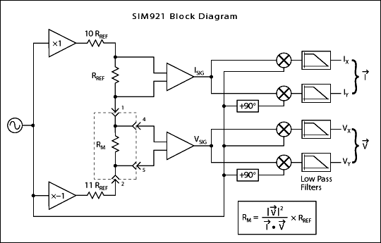 SIM921 измеряет сопротивление с помощью четырехпроводной цепи, исключая влияние сопротивления выводов на результат. Благодаря использованию источника переменного тока возбуждения исключаются термоЭДС и дрейф смещения усилителя.