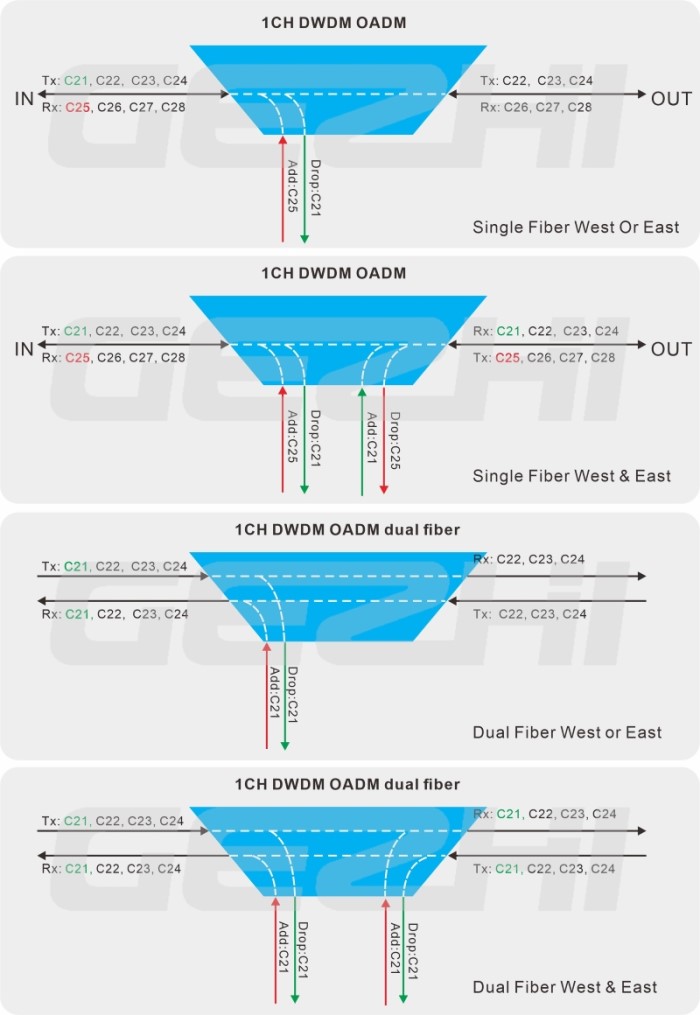 Модули DWDM OADM выпускаются в одностороннем (восток или запад) и двустороннем (восток и запад) исполнении. Каждый модуль DWDM OADM использует длины волн, соответствующие стандарту сетки ITU-T DWDM.