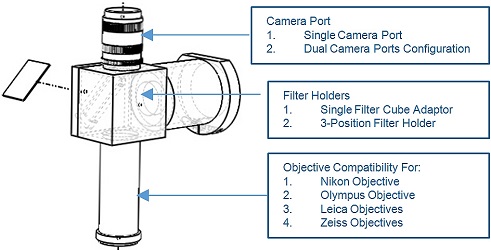 Оптическая сборка системы OASIS компании от Mightex позволяет пользователю связать все элементы в уникальную конфигурацию, подходящую под требования заказчика. Для начала пользователю необходимо решить какой объектив ему больше подходит: макрообъектив или микроскопическая оптика. Микроскопическая оптика подходит для применений, требующих оптику схожую с коммерческими микроскопами. Макроскопический объектив требуется в том случае, когда необходим широкий угол обзора без потери интенсивности. Пользователь также может выбрать количество мест под фильтры для установки в оптическую сборку, вариант с двумя камерами или совместимость с объективами известных фирм.