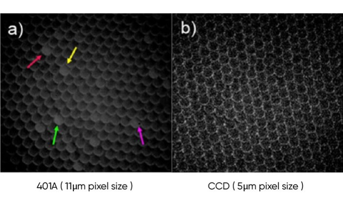 Для тех, кто ищет чувствительность, которая раньше достигалась за счет биннинга в ПЗС-матрице, Dhyana 401A-G обеспечивает 11-микронный пиксель, аналогичный биннингу классической ПЗС-матрицы в 2 или 3 раза. Наряду с такой чувствительностью, он обеспечивает полную мощность в 90 000 электронов, что позволяет наблюдать слабые и сильные сигналы на одном изображении.