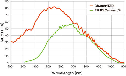 Dhyana 9KTDI использует технологию sCMOS с обратной засветкой и имеет спектральную характеристику от 200 до 1100 нм. В сочетании с 256-уровневым TDI и технологией охлаждения ее можно использовать в полях с низкой освещенностью, таких как ультрафиолет, видимый свет и ближний инфракрасный диапазон.