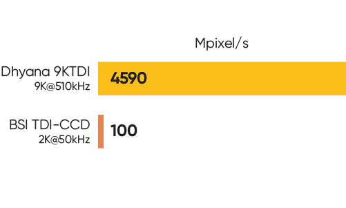 Dhyana 9KTDI оснащена новейшим высокоскоростным интерфейсом CXP-12. Линейная частота 9K при 510 кГц означает скорость передачи данных 4590 мегапикселей в секунду, что почти в 6 раз выше, чем у современных 8K камер линейного сканирования, и более чем в 50 раз выше, чем у ПЗС TDI камер с обратной засветкой.