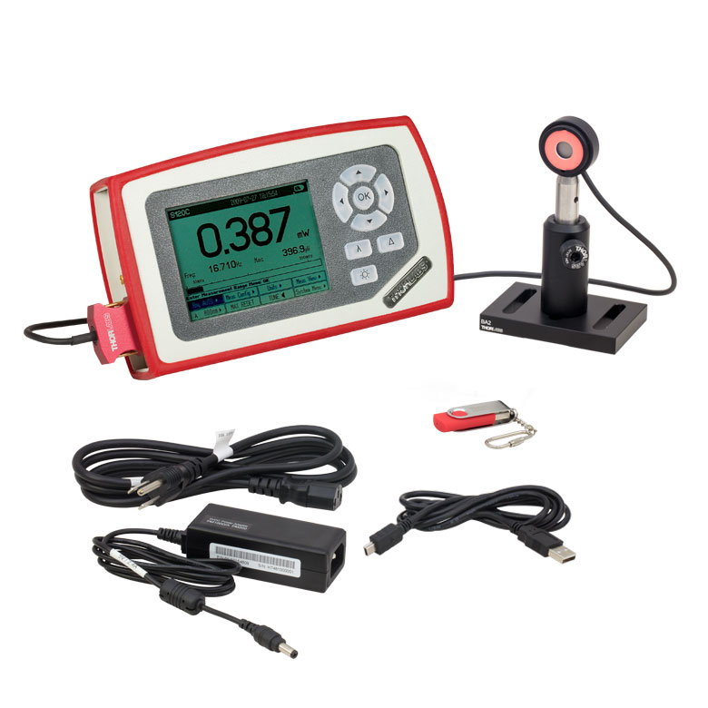 Наборы для измерения оптической мощности состоят из консоли, фотодиода C-серии или термодатчика мощности и узла для крепления на стержне. За исключением PM120VA, который включает в себя консоль аналогового измерителя мощности PM100A, датчик в каждом комплекте сопряжен с цифровой консолью измерителя мощности PM100D или PM400 с сенсорным экраном.