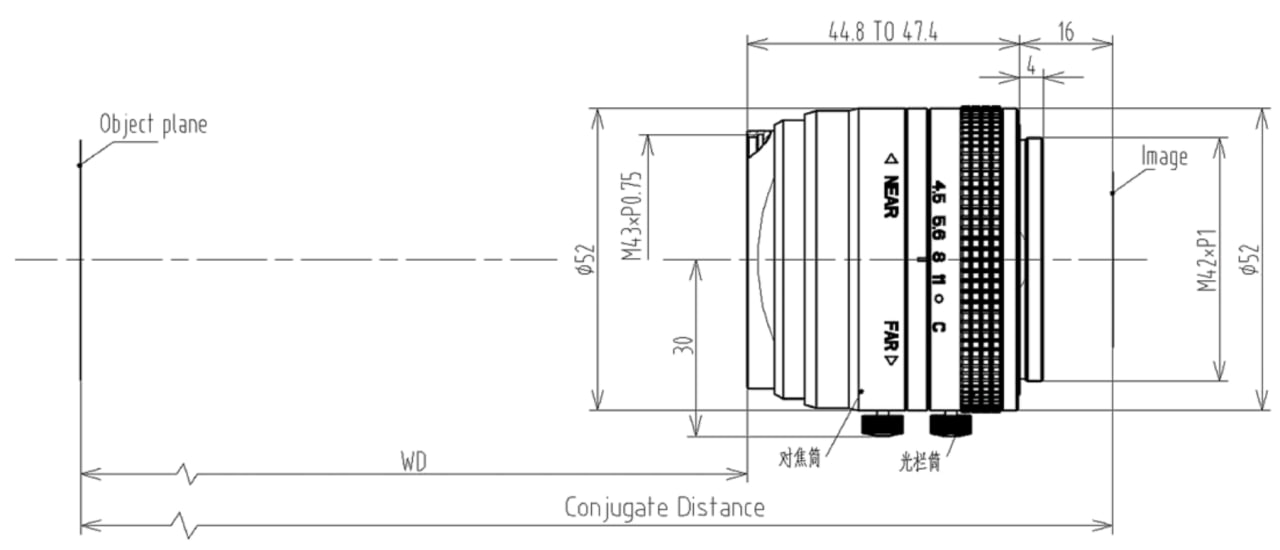Оптическая схема рассчитана на работу в широком спектральном диапазоне 400–950 нм, что позволяет использовать объектив как с видимым светом, так и с ближним ИК-подсветом. Ручная регулировка фокуса и диафрагмы обеспечивает точную настройку под конкретные условия съёмки.