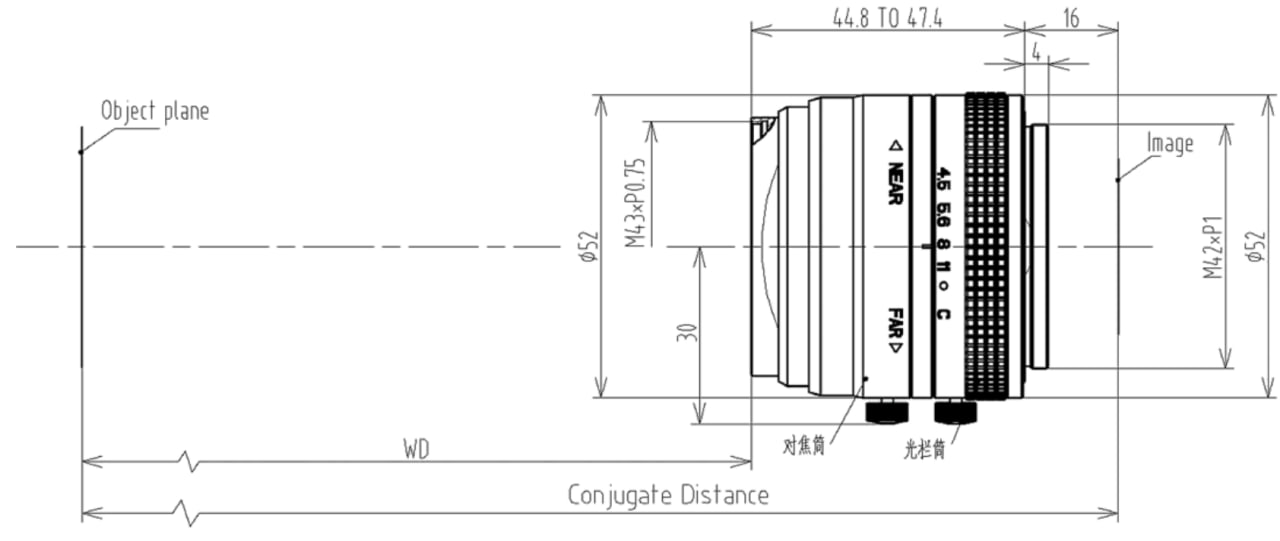 Оптическая схема рассчитана на работу в диапазоне 400–950 нм, что обеспечивает совместимость с различными типами подсветки, включая видимый и ближний инфракрасный диапазон. Ручная регулировка фокуса и диафрагмы позволяет точно адаптировать объектив под условия конкретной системы.