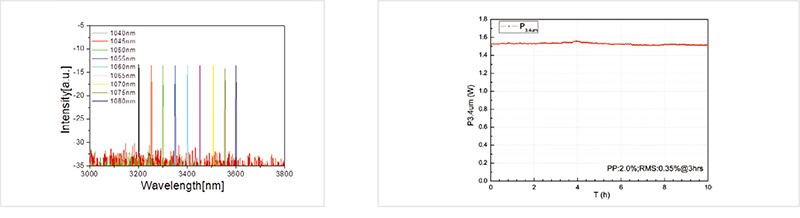 Precilasers предлагает однопроходный волоконный лазер на разностной частоте (FL-SDFG, ГРЧ), который состоит из полностью оптоволоконного усилителя с задающим волоконным лазером DFB (лазер с распределённой обратной связью) со сверхтонкой шириной спектральной линии и однопроходного блока PPLN DFG для получения мощного лазерного излучения среднего ИК диапазона. Волоконный лазер с ГРЧ (DFG) может охватывать диапазон длин волн от 2400 до 4000 нм и обладает узкой спектральной шириной линии (менее 200 кГц за 100 мкс) и высоким качеством пучка (M² <1.1). Лазер устойчив к скачкообразным изменениям мод, стабилен в широком диапазоне температур и при значительном воздействии окружающей среды, что отлично подходит для синхронизации по частоте