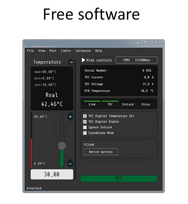 TCXXXX — это серия компактных OEM контроллеров ТЭО (термоэлектрических охладителей) для высокой мощности. Уникальные схемные решения контроллера ТЭО позволяют достичь высокой эффективности (до 97%) и высокой плотности мощности. Алюминиевая базовая пластина обеспечивает эффективный отвод тепла от контроллера с помощью водяного или воздушного охлаждения. Контроллеры ТЭО обладают большим количеством функций защиты для безопасной работы элемента Пельтье. Основные области применения мощных контроллеров ТЭО - температурная стабилизация лазерных диодов, светодиодов, полупроводниковых приборов, оптики, волокон, химических элементов и т. д.