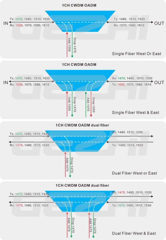 Модули CWDM OADM доступны в одностороннем (восток или запад) и двухстороннем (восток и запад) исполнении. Каждый модуль CWDM OADM использует длины волн, соответствующие стандарту ITU-T G.694.2 CWDM-сетки от 1270 до 1610 нм с шагом 20 нм.