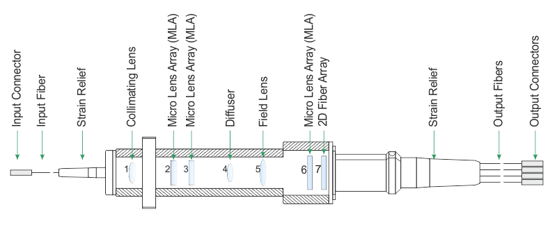 Оптические разветвители обычно имеют n2 выходных порта. На данный момент максимальное количество этих портов составляет 400. Оптические элементы размещены в анодированном алюминиевом корпусе, который можно настроить для различных применений.
