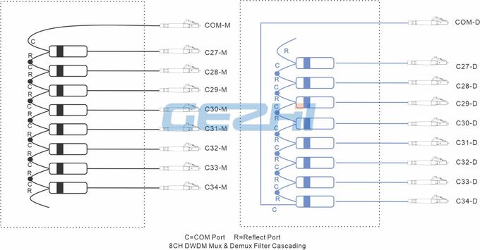 Двухволоконные DWDM mux-пассивные фильтры GEZHI для сетей с 1x8 каналами предлагают высокопроизводительные терминальные DWDM-решения для расширения сети. Эти сети с двухволоконными DWDM-мультиплексорами с пассивными фильтрами 1x8 каналов используются для передачи данных на большие расстояния, где длины волн плотно распределены по C-диапазону в сетке 100 ГГц (0,8 нм). Двухволоконные пассивные фильтры DWDM mux для сетей с 1x8 каналами прозрачны по протоколу и подходят для приложений, включая SDH / SONET, 10/1g Ethernet, 16/8/4/2/1g Fibre Channel, CATV, FTTx и т.д.