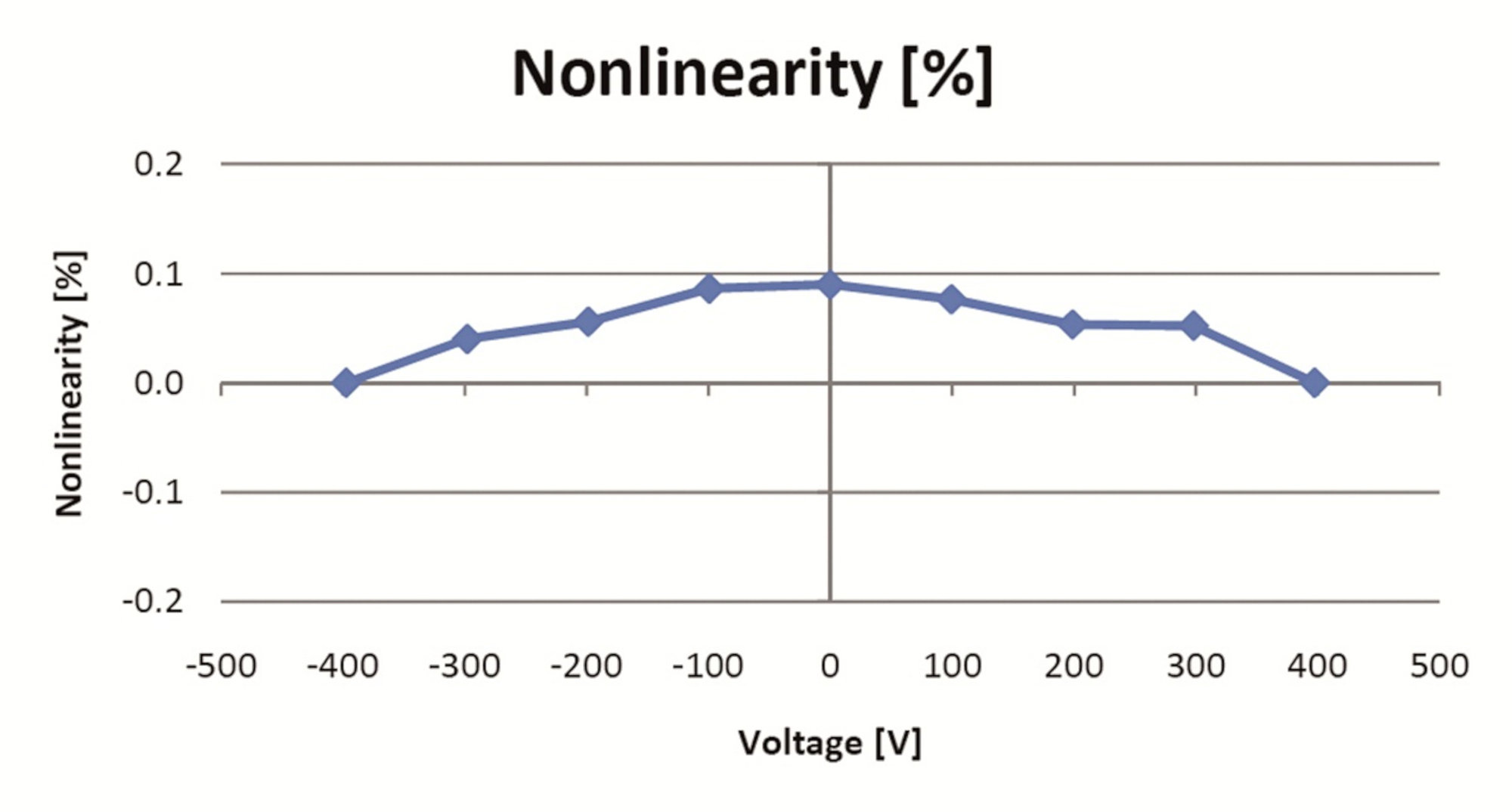 Отличительной особенностью пьезоактуаторов серии Picoactuator является высокая линейность при позиционировании, а также отсутствие изменения размеров с течением времени при фиксированном управляющем напряжении. На графике ниже представлена зависимость нелинейности, выраженная в процентах, от управляющего напряжения. Нелинейность составляет менее 0.2%. Пьезоактуаторы P-405 адаптированы для работы в вакууме до 10-9 гПа. Существует возможность производства пьезоактуаторов с внутренним отверстием и с разным типом наконечника. Рабочий температурный диапазон пьезоактуаторов P-405 составляет -20…+85 °С. Управление пьезоактуатором P-405 осуществляется путём подачи напряжения от -500 В до +500 В. Пьезоактуаторы серии P-405 могут применяться для исследований, в промышленности, где требуется высокая динамика позиционирования без применения обратной связи.