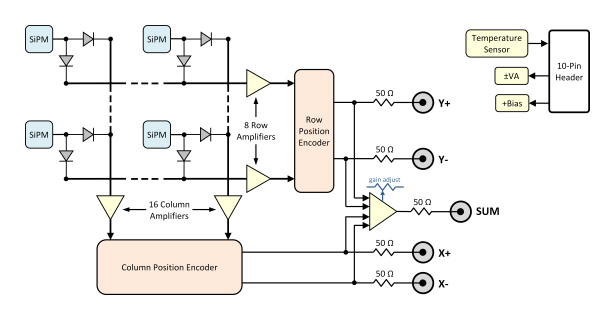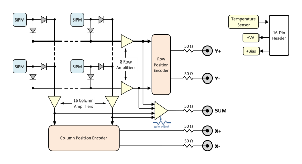 - 4-канальная схема - 4 кодированных позиционных сигнала: X+, X-, Y+, Y-. - для матриц кремниевых фотоумножителей SensL серии ArrayJ формата 16x16 |