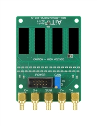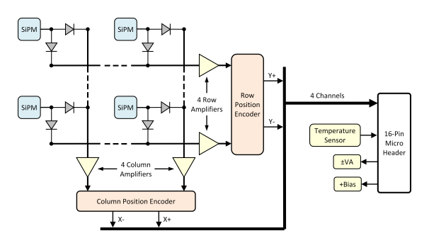 - 4-канальная схема - 4 кодированных позиционных сигнала: X+, X-, Y+, Y-. - для матриц кремниевых фотоумножителей SensL серии ArrayJ формата 4x4 |