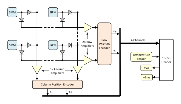 - 4-канальная схема - 4 кодированных позиционных сигнала: X+, X-, Y+, Y-. - для матриц кремниевых фотоумножителей SensL серии ArrayJ формата 12x12