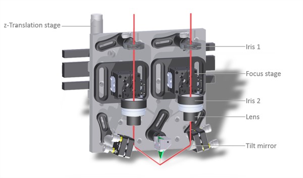Подсистема D-B2 представляет собой вертикальную платформу, содержащую базовый модуль D-B1, а также дополнительные компоненты направления пучка. В нем достаточно места для дополнительных компонентов, таких как ПЗС-камера для контроля наконечника зонда или датчик расстояния для отбора проб с профилированных или наклонных поверхностей образца.
