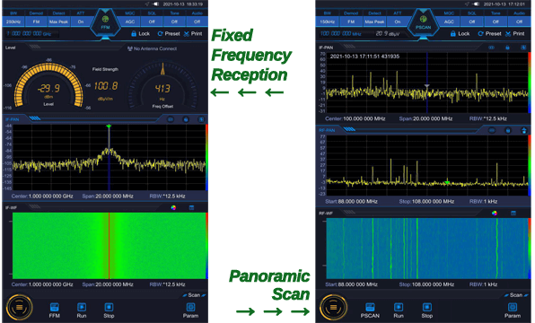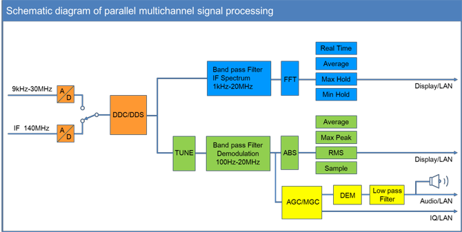 Три параллельных канала обработки обеспечивают измерение спектра, измерение напряженности поля уровня и функцию демодуляции соответственно, что удобно для пользователей для получения многодоменного корреляционного анализа.