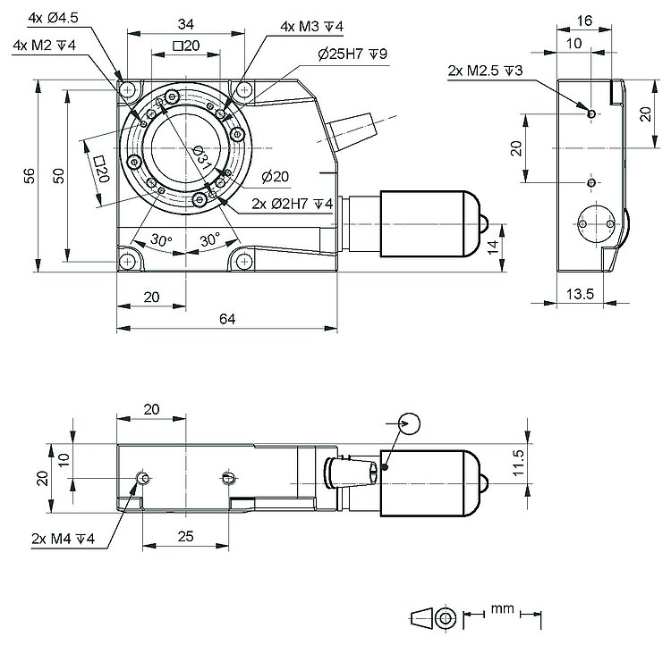 Поворотные платформы серии RS-40 очень компактны, имеют апертуру диаметром 20 мм. Диаметр для крепежа нагрузки составляет 25 мм. В платформе используется червячная передача с практически нулевым люфтом. Прецизионная механика позволяет платформе достичь высокой равномерности и точности перемещения. В RS-40 используются 2-х фазные шаговые двигатели или DC-двигатели с редуктором. Для модели с DC- двигателем максимальная нагрузка составляет 2 кг, для модели с 2-х фазным шаговым двигателем – 1 кг. Крутящий момент для всех модификаций составляет 0.2 Н·м. Все поворотные платформы серии RS-40 оснащены датчиками нулевого положения.