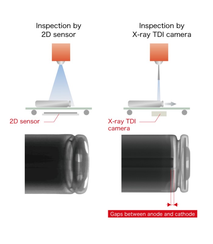 При рентгеновском контроле с использованием 2D-датчиков иногда на изображениях за пределами центра излучения источника рентгеновского излучения возникают искажения в результате того, что падающие рентгеновские лучи направлены под углом к объектам. Это требует корректировки положения в каждой отдельной точке захвата изображения для обеспечения точного контроля. Принимая во внимание, что с рентгеновскими камерами TDI рентгеновские лучи излучаются под прямым углом к направлению переноса, а визуализация выполняется путем объединения непрерывно полученных изображений. В результате могут быть получены изображения без искажений.