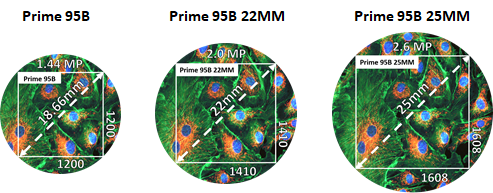 Модели с разным полем обзораКамеры Prime 95B Teledyne Photometrics доступны с диагональю поля зрения 18.8 мм, 22 мм или 25 мм. Датчики большего формата предназначены для увеличения пропускной способности, максимизации объема получаемых данных и использования всех преимуществ новых микроскопов с увеличенным полем обзора. |