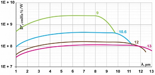 - высокая эффективность в спектральном диапазоне длин волн от 2 до 13 мкм;