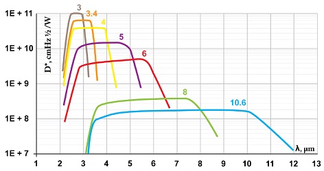 - высокая эффективность в спектральном диапазоне длин волн от 2 до 12 мкм;