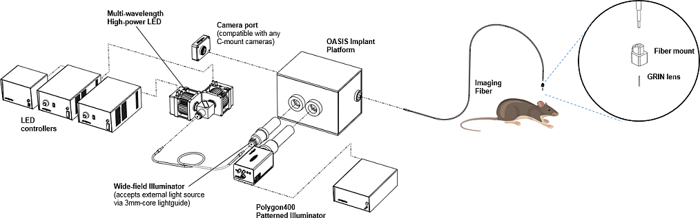 Система OASIS Implant поддерживает как равномерное широкоугольное освещение, так и динамическое освещение при использовании динамического осветителя Polygon400 от Mightex с шаблонами освещения. Универсальность платформы OASIS Implant позволяет исследователю использовать оба метода освещения одновременно. Одним из примеров является использование динамического освещения для стимуляции оптогенетически выбранных нейронов, наблюдая флуоресцентные изображения с широкоугольной подсветкой. Другим примером является использование структурированного освещения от динамического осветителя для подавления фона во время визуализации флуоресценции.