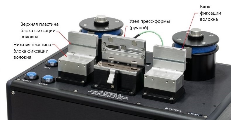 В системе Vytran Thorlabs PTR308 используется пневматический узел пресс-формы для управления платами пресс-формы. Такая конструкция позволяет вводить материал для покрытия непосредственно в полость формы, исключая излишки материала, которые требовали бы очистки после каждого повторного покрытия. Кроме того, когда волокно закреплено в удерживающих его блоках, весь процесс повторного покрытия выполняется автоматически.
