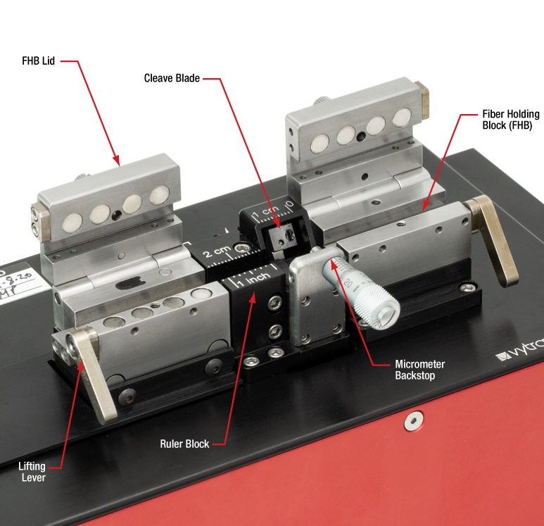 Крупный план системы скалывания LDC450B. Зажимной винт в верхней части каждого удерживающего блока может быть затянут, чтобы обеспечить дополнительное усилие для захвата волокон с внешним диаметром ≥500 мкм. Магниты в каждом удерживающем блоке обеспечивают достаточное усилие для зажима волокна меньшего диаметра.