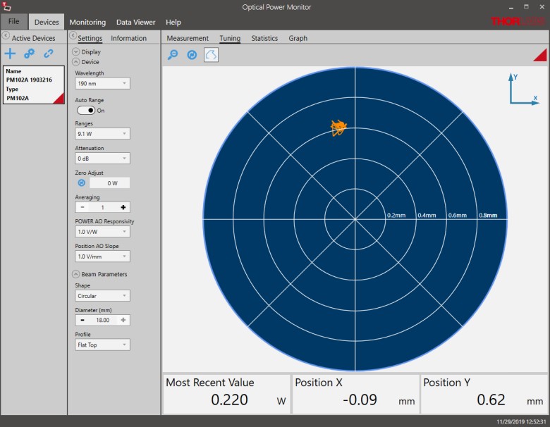 1. Настройка положения: визуализация положения пучка на датчике. Видимая область может регулироваться между центрированным кругом Ø1 мм и Ø6 мм. Слева показана мощность, измеренная по всей поверхности сенсора, и координаты X и Y луча. Дополнительная настройка может отображать визуальную трассировку положения с течением времени.