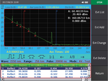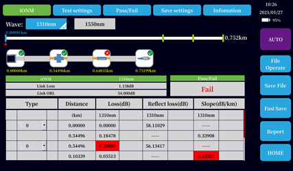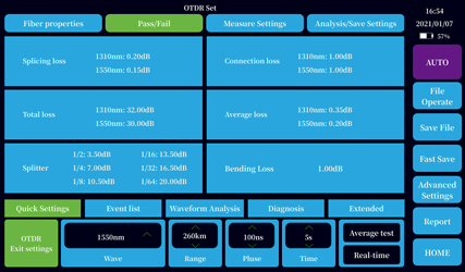 - Настройки OTDR, включая свойства волокна, порог прохождения / сбоя, условия измерения и настройки анализа / сохранения