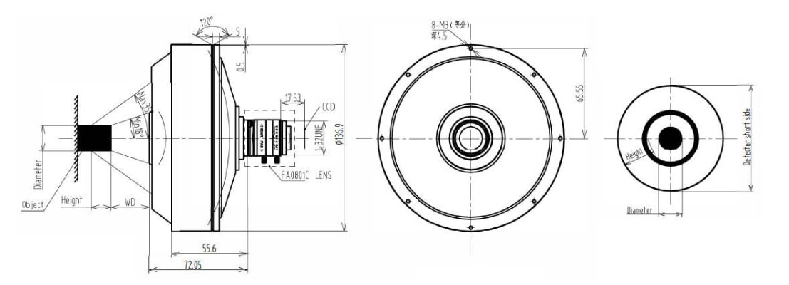 Специализированный объектив для высокоточной панорамной инспекции внешних поверхностей мелких объектов. Обеспечивает полный обзор боковой поверхности по всей окружности, что делает его идеальным решением для контроля геометрии, дефектов и резьбы на таких изделиях, как флаконы, горлышки бутылок и другие цилиндрические компоненты. Минимальный диаметр контролируемого объекта всего 4.5 мм.