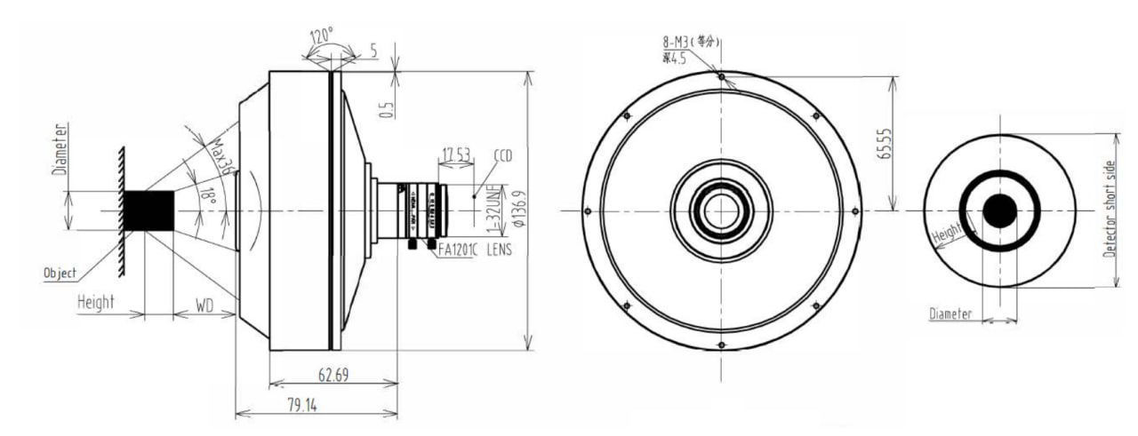 Специализированный объектив для панорамного контроля внешних поверхностей цилиндрических объектов. Обеспечивает полный круговой обзор, что делает его идеальным решением для инспекции геометрии, резьбовых соединений и выявления дефектов на таких изделиях, как флаконы, горлышки бутылок и другие цилиндрические компоненты.