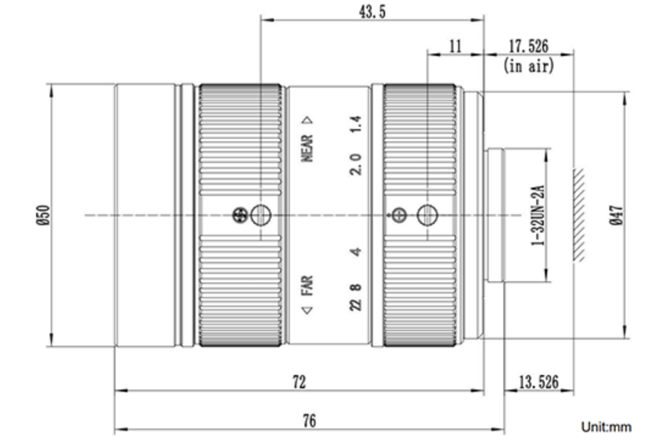 Объектив с ИК-коррекцией имеет фокусное расстояние 35 мм и числовую апертуру F1.4. Предоставляет разрешение 12 мегапикселей для матриц формата 1,1 дюйма с возможностью ручного управления диафрагмой.