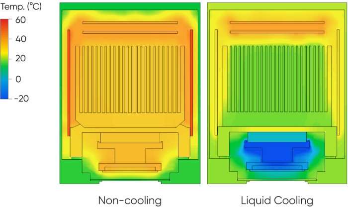 Dhyana 2100 имеет два метода охлаждения - жидкостное или воздушное, что обеспечивает низкий темновой ток и термостабильность. Охлаждение необходимо при быстродействующей работе широкоформатных камер из-за огромного выделяемого тепла, которое увеличивает темновой ток и вариации измерений на датчике с течением времени по мере изменения температуры датчика.