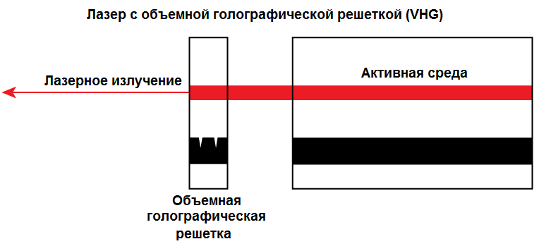 Как правило, решетка состоит из фоторефрактивного материала (стекло), который имеет периодическое изменение показателя преломления. Только длина волны излучения, которая удовлетворяет условию Брэгга для решетки отражается обратно в резонатор лазера, что приводит к излучению лазера с крайне стабильной длиной волны. VHG-стабилизированный лазер может генерировать излучение с аналогичной шириной линии, как и DFB лазер, но при большей мощности. При этом длина волны излучения стабильна в широкм диапазоне температур и значений тока.