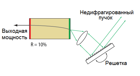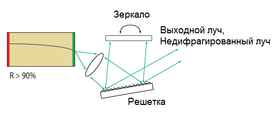 Здесь n – порядок дифракции, λ – дифрагированная длина волны, d – постоянная решетки (расстояние между штрихами). При n > 0 дифракционная решетка будет пространственно разделять полихромные падающие лучи, дифрагируя их под углом θ', который зависит от длины волны. После спектрального разделения, могут быть использованы разнообразные средства для селективного отражения света с определенной длиной волны обратно в усиливающую среду.