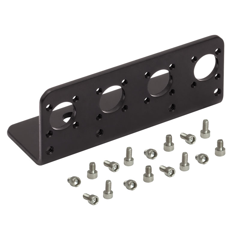 Скоба ADABS3 разработана для крепления четырёх оптоволоконных розеток для разъёмов FC с квадратным фланцем. L‑образная конструкция позволяет разместить четыре розетки в компактном блоке, обеспечивая удобный доступ для подключения патч‑кордов и надёжную разгрузку кабелей. Посадочные места рассчитаны на стандартный квадратный фланец, а комплектный крепёж позволяет быстро установить розетки на скобу. Такое решение удобно для формирования небольших коммутационных панелей непосредственно на оптическом столе или в составе экспериментальной установки.