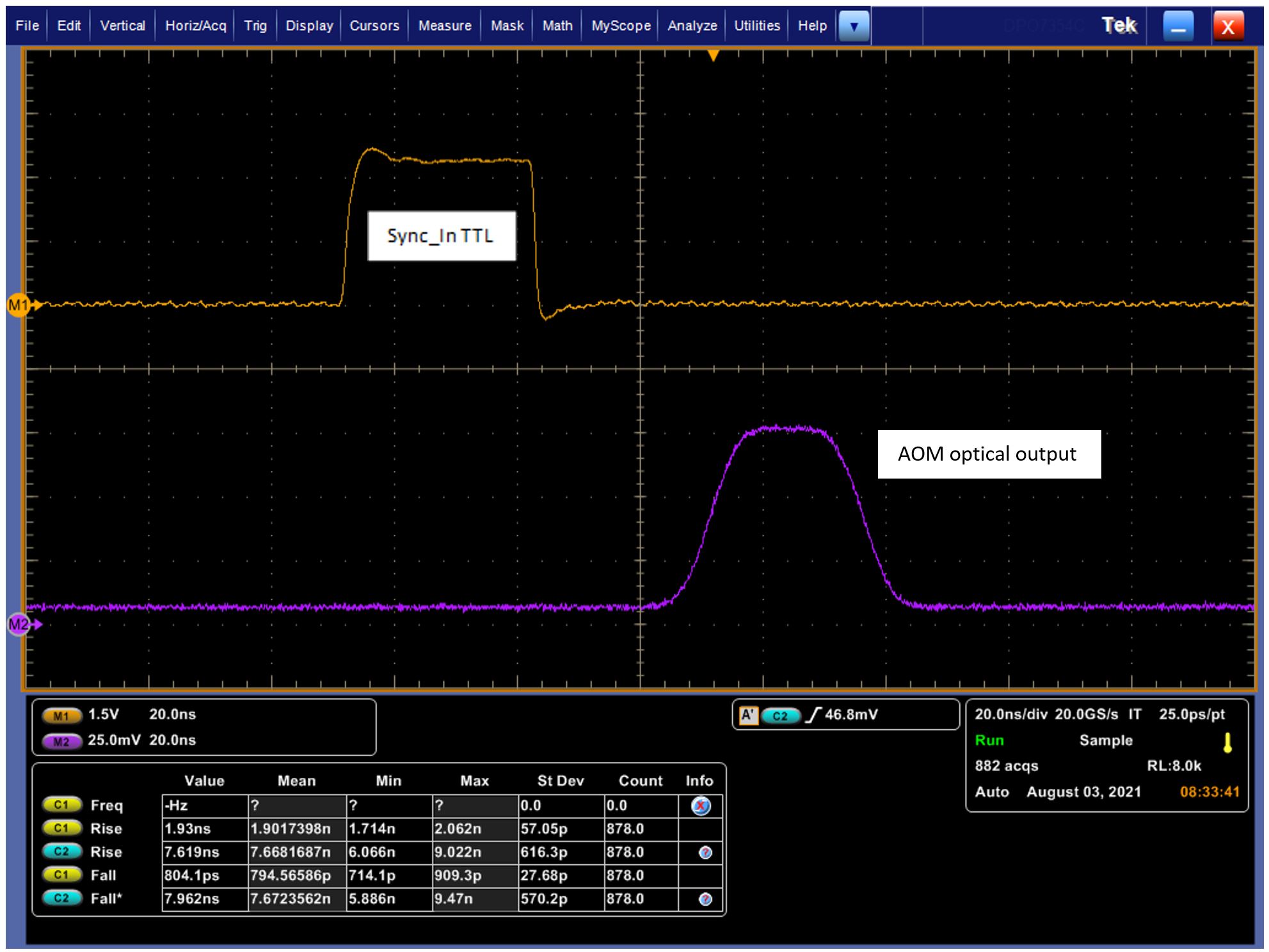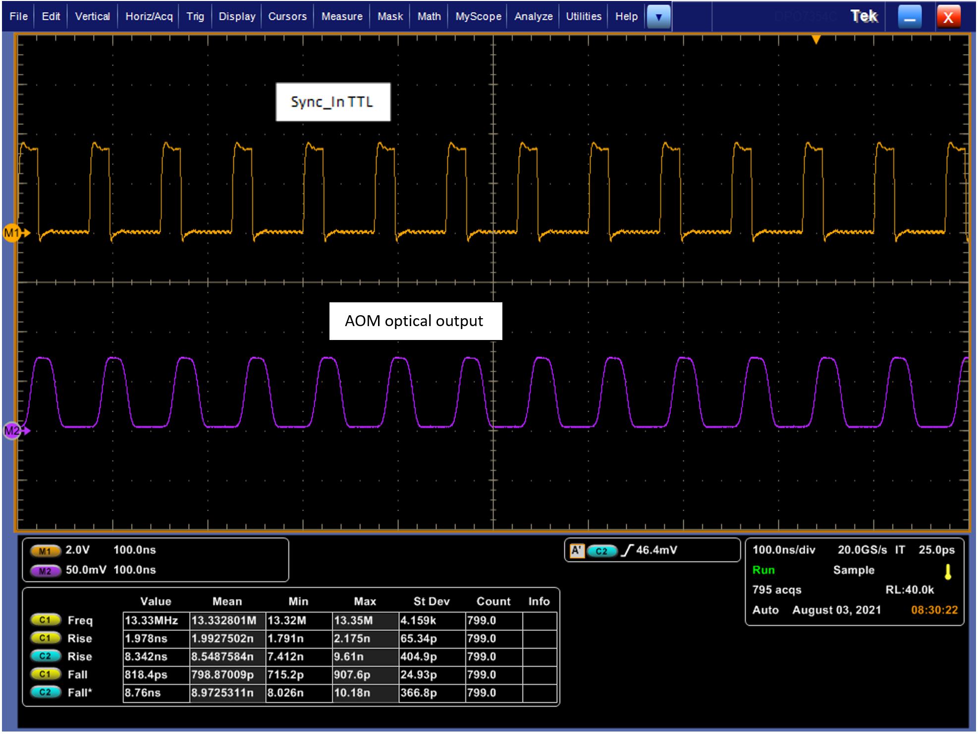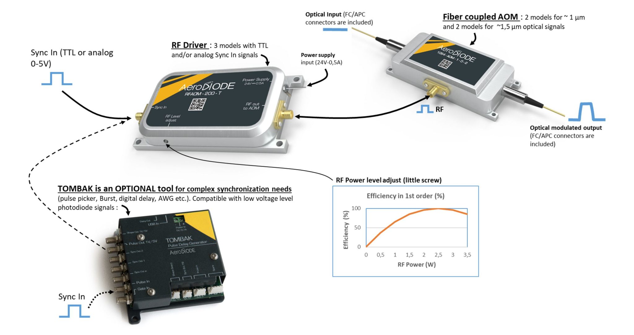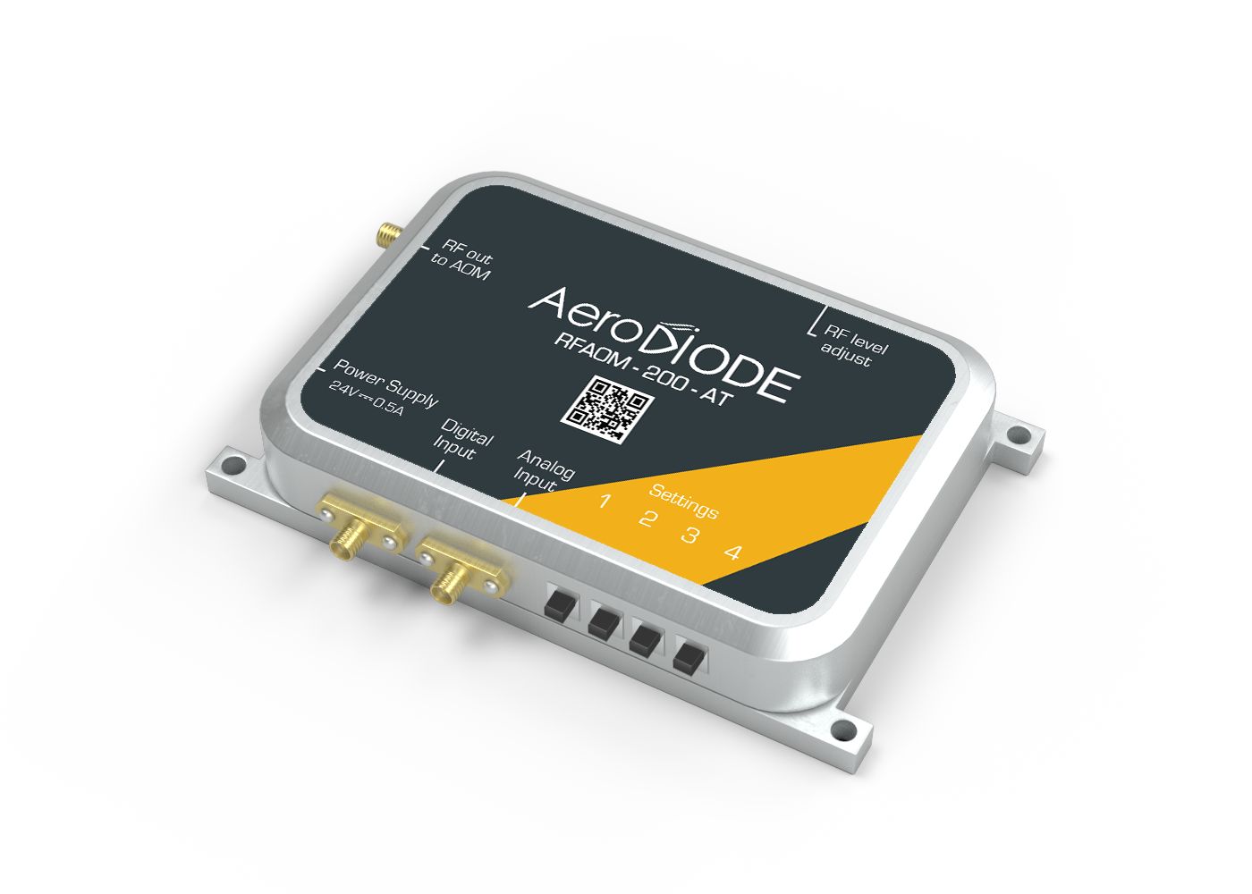 Компания AeroDIODE предлагает прецизионные акусто-оптические модуляторы, сопряженные с оптоволокном, и РЧ-драйверы с дополнительными инструментами синхронизации. Данные системы разработаны для создания оптимизированного решения для амплитудной модуляции света волоконного лазера. Доступны модели АОМ для 1030/1064 или 1550 нм. Они позволяют напрямую контролировать синхронизацию, интенсивность и временную форму выходного сигнала лазера. Требуемые РЧ-драйверы предлагаются с цифровым входом (TTL) или аналоговым входом