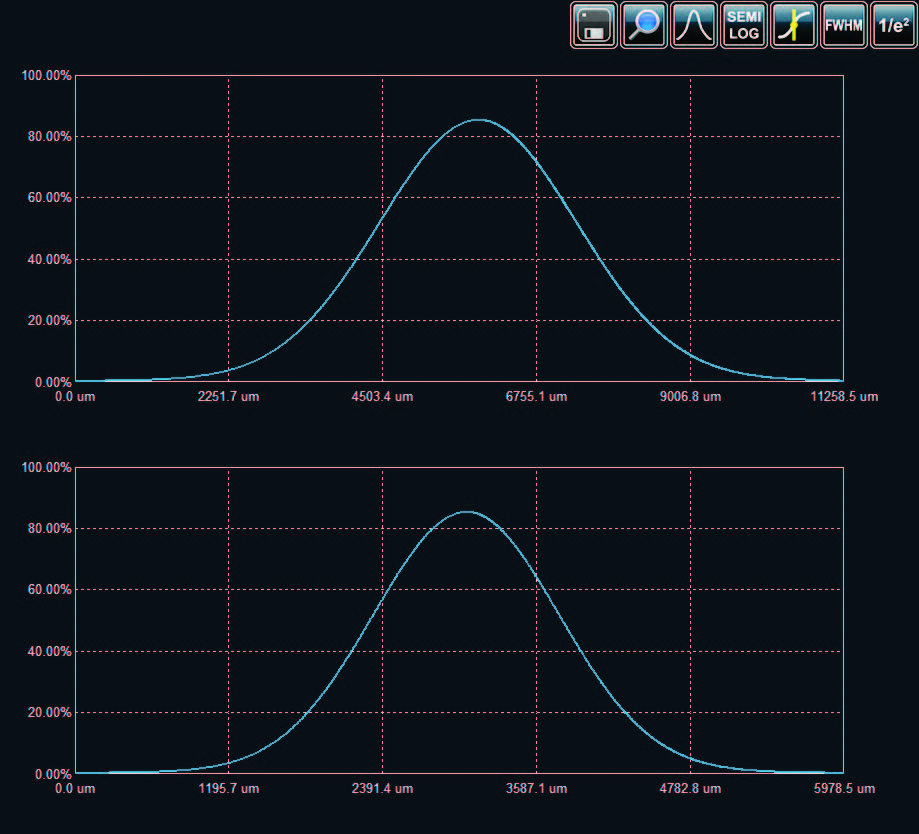 Данный экран отображает поперечное сечение луча вдоль перекрестия. Этот дисплей содержит множество полезных инструментов, таких как масштабирование, курсор, FWHM и 1/e2 уровни. Также можно отображать графики в полулогарифмическом масштабе, чтобы увеличить детали в низкоинтенсивных частях луча. |