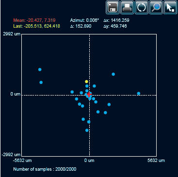Дисплей отслеживания луча позволяет визуализировать изменение положения центра пучка на датчике. На этом дисплее отображается последняя расчетная позиция, а также предыдущая, пока пользователь не нажмет на сброс. На дисплее также отображается среднее положение всех вычисленных значений и дается информация о стабильности положения для осей X и Y. Этот инструмент отлично подходит для контроля стабильности луча с течением времени. |