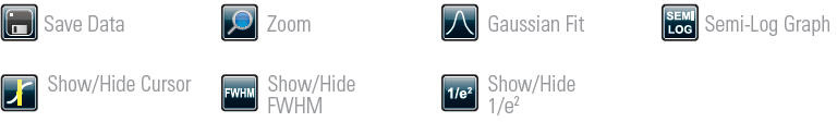 Дисплей с XY проекциями: Сохранение данных, Увеличение, Аппроксимация Гауссом, график в полулогарифмическом масштабе, Показывать/спрятать курсор, Показывать/спрятать полуширину (FWHM), Показывать/спрятать 1/e2 |