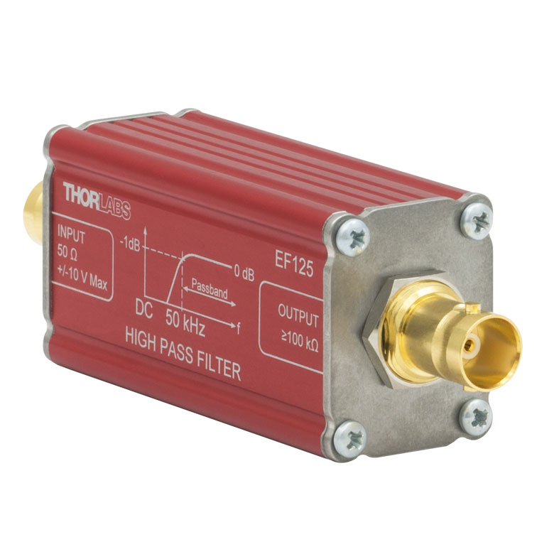 Пассивный фильтр высоких частот с полосой пропускания более 50 кГц используется в измерительных трактах, где требуется более агрессивное отсечение низкочастотных компонентов и акцент на быстрых сигналах. Он подходит для диагностики импульсных процессов, работы с фотодетекторами и анализа сигналов, чувствительных к медленному дрейфу базовой линии. Два гнездовых разъема BNC обеспечивают простое включение в распространенную лабораторную схему подключения.