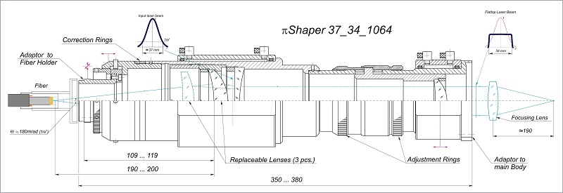 - с изменением формы входного луча можно адаптировать pi-Shaper для обеспечения выходного профиля плоским верхом (flattop), эта адаптация реализуется путем изменения диаметра пучка источника излучения;