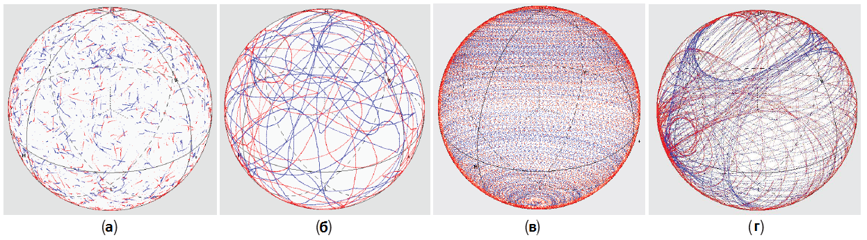 Визуализация процесса изменения состояния поляризации. а - дискретный метод, б - Релеевский, в - «Tornado» (фиксированная ось), г - «Tornado» (вращающаяся ось)
