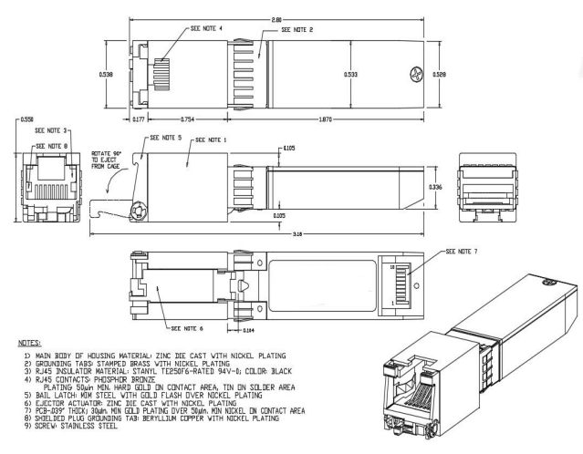 Медный трнсивер 10GBASE-T SFP + специально разработан для высокоскоростных линий связи, для которых требуется 10-гигабитный Ethernet по кабелю Cat 6a / 7. Это первый трансивер SFP +, обеспечивающий передачу данных со скоростью 10 Гбит / с по этому типу носителей.