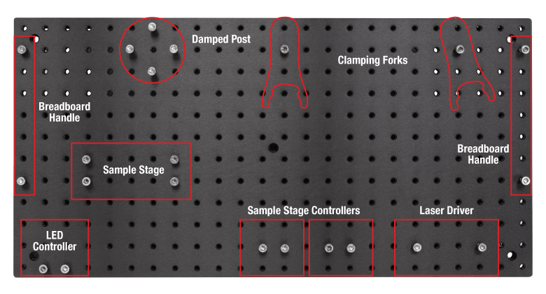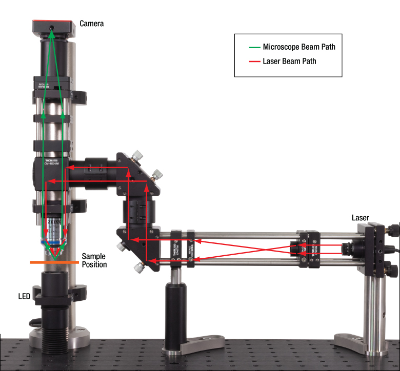 В наборе EDU-OT3 (/M) в качестве источника излучения используется лазерный диод L658P040 с длиной волны 658 нм. Этот лазер мощностью 40 мВт позволяет легко наблюдать пятно через микроскоп во время работы для интуитивно понятных демонстраций в аудитории. Лазер фокусируется через объектив Zeiss 63X, 0.8 NA, который также служит объективом для микроскопа. Освещение образца осуществляется с помощью белого светодиода MCWHL5 предыдущего поколения, и образец просматривается через CMOS-камеру CS165CU (/M).
