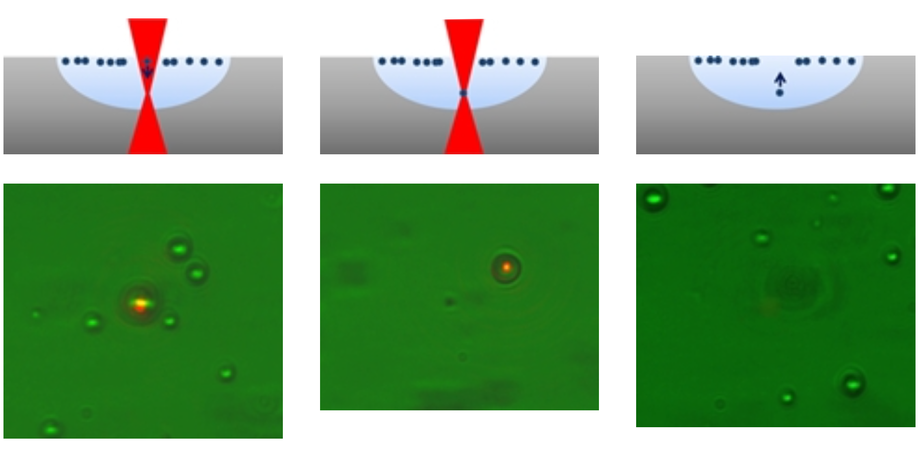 Вторая, более важная сила – это градиентная сила. Если лазерный луч воздействует на частицы с более высоким показателем преломления, чем водная среда, в которой они диспергированы, они движутся в направлении максимальной интенсивности света, позволяя частицам задерживаться в фокальной плоскости лазера. Если лазер сильно сфокусирован, градиентная сила может превысить силу рассеяния, так что частицы могут быть захвачены и перемещены во всех трех пространственных измерениях.