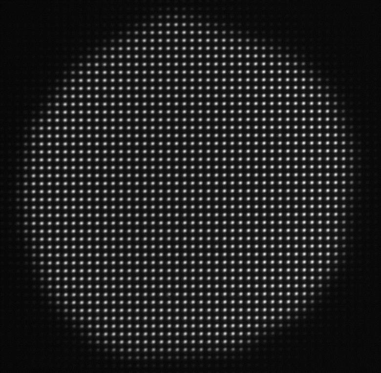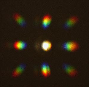 Слева: сетка 150 лин/мм; Справа: соответствующая дифракционная картина в задней фокальной плоскости объектива